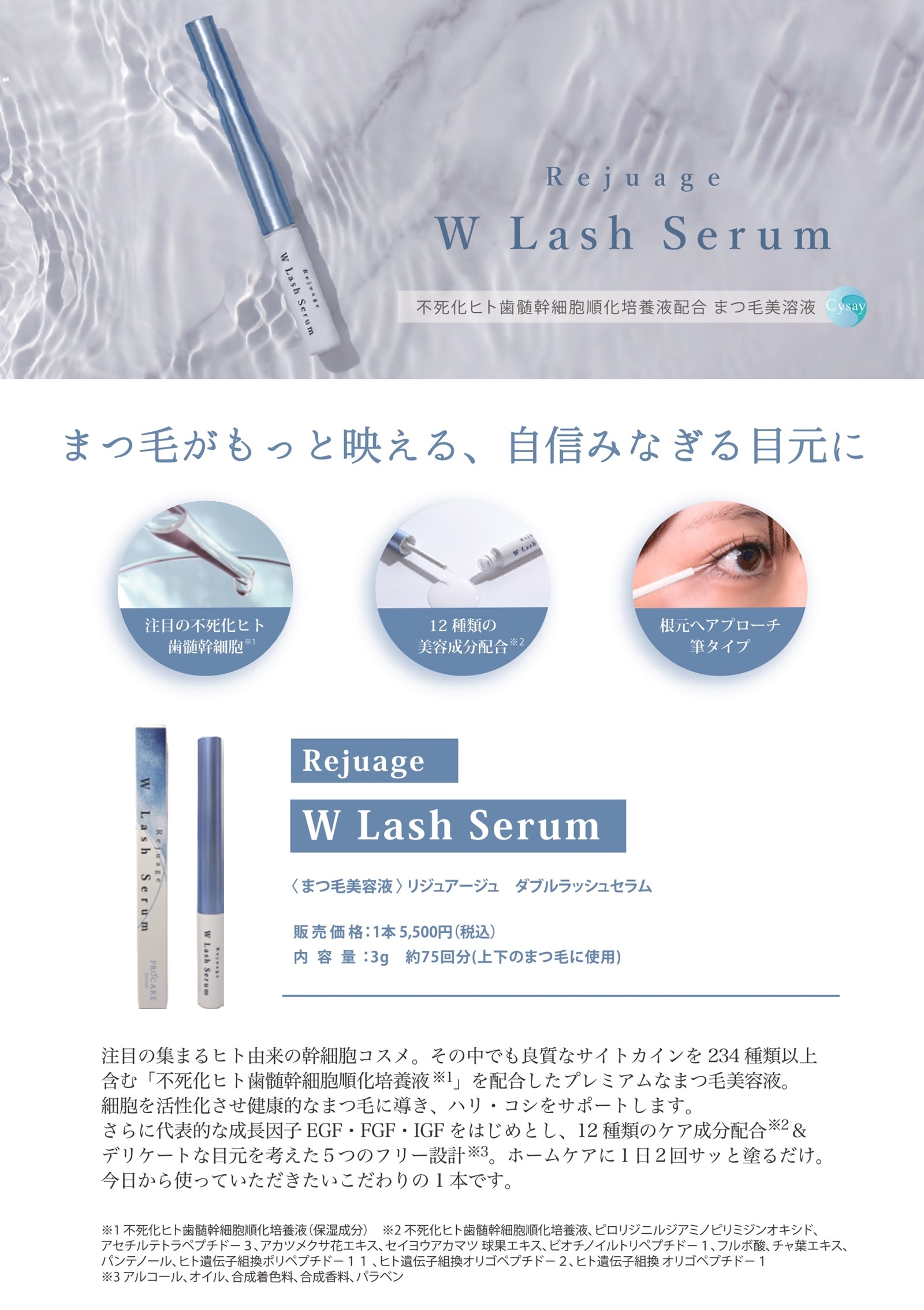 - 注目の集まるヒト由来の幹細胞コスメ。その中でも良質なサイトカインを234種類以上含む「不死化ヒト歯髄幹細胞順化培養液※」を配合したプレミアムなまつ毛美容液。